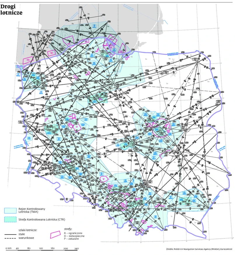 Po wejściu Polski w 2004 r. do Unii Europejskiej otworzyliśmy niebo dla tanich przewoźników. Na efekty nie trzeba było długo czekać. W kilka lat ruch lotniczy wzrósł o ponad 100 proc. Na polskim niebie na wysokości od 3 do 13 km powstały swego rodzaju autostrady. W ok. 40 proc. korzystają z nich samoloty, które startują i lądują w Polsce, ale pozostałe 60 proc. ruchu to tranzyt.