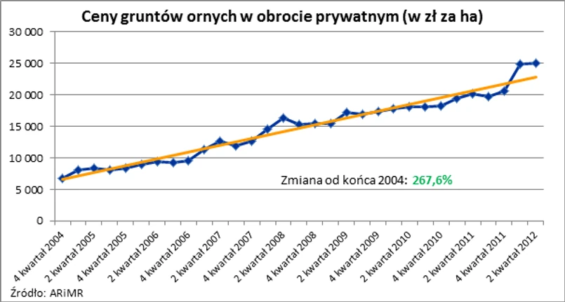 Wysoki popyt na grunty rolne jest w dużym stopniu efektem zakupów o charakterze inwestycyjnym. Inwestorzy wybierają ziemię jako bezpieczną lokatę kapitału w okresie niepewności na rynkach. W przypadku gruntów ornych dodatkowo otrzymują potencjalnie wysoką stopę zwrotu. Kupując grunt w drugim kwartale zeszłego roku można było zyskać w skali roku średnio 24,2%. Dla porównania, zgodnie z danymi NBP przeciętna roczna lokata założona w kwietniu ub.r. była oprocentowana na poziomie 4% brutto. W przypadku inwestowania w spółki z indeksu WIG 20 pomiędzy początkiem kwietnia 2011 i 2012 roku można natomiast było zanotować stratę na poziomie 18,8%. W dłuższym terminie, a więc licząc od końca 2004 roku (od kiedy publikowane są dane o cenach gruntów w obrocie prywatnym) przeciętny hektar drożał o 267,6%. Co więcej wzrost ten jest konsekwencją nieprzerwanego trendu wzrostowego, który panuje na tym rynku od 30 kwartałów.