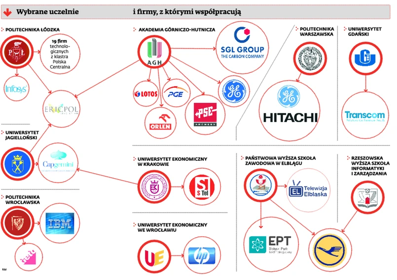 Właśnie dlatego Uniwersytet Zielonogórski podpisał w tym roku umowę o współpracy z firmą informatyczną REC. W jej ramach studenci z wydziałów informatycznego, elektronicznego i telekomunikacyjnego uczestniczą w wykładach prowadzonych przez najbardziej doświadczonych pracowników REC, do tego mają zapewnione praktyki i staże w firmie. Z kolei Politechnika Łódzka rozpoczęła ścisłą współpracę z firmą Ericpol Telecom – jedną z największych w Polsce firm specjalizujących się w tworzeniu programów komputerowych, a także ze spółką Compex. Obydwie zapewniają uczelni nie tylko merytoryczne i finansowe wsparcie, lecz także gwarantują pracę najlepszym absolwentom.