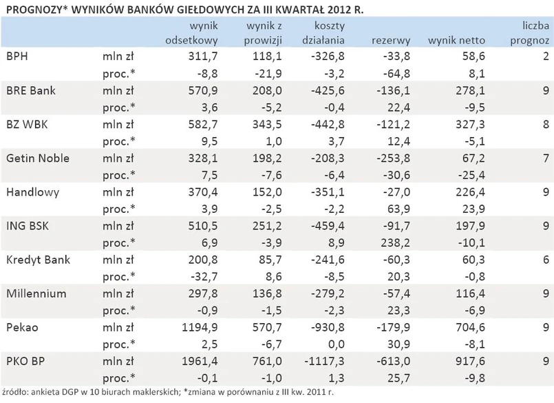 Zyski giełdowych banków były w III kw. o 6,8 proc. mniejsze niż rok wcześniej – prognozują analitycy z dziesięciu domów maklerskich, ankietowani przez DGP. Jedenaście dużych giełdowych banków przez trzy miesiące zarobiło ich zdaniem niespełna 3,0 mld zł. Danych dla całego sektora bankowego jeszcze nie ma. Pogorszenie wyników to w głównej mierze efekt konieczności zawiązywania wyższych rezerw na złe kredyty. Giełdowe banki utworzyły w III kw. rezerwy o wartości 1,7 mld zł, o 10 proc. większe niż rok wcześniej. Standardem są odpisy o jedną czwartą wyższe niż w analogicznym okresie 2011 r.