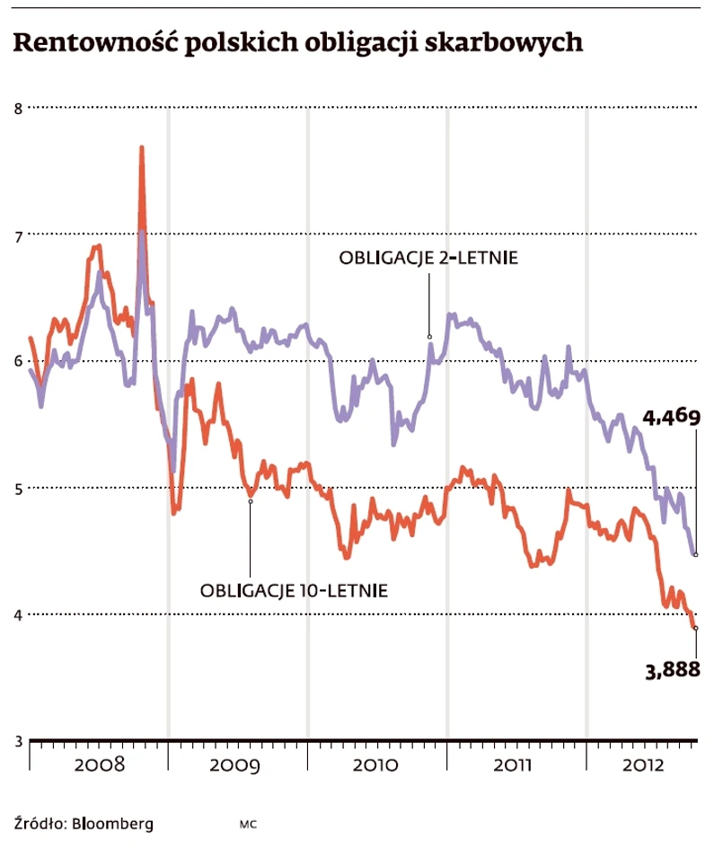 A dla papierów dziesięcioletnich do rekordu z września 2005 r. – czyli 4,43 proc. – też już niewiele brakuje, bo tylko 4 pkt bazowe. – Stopa referencyjna NBP wynosi 4,75 proc. Różnica między nią a rentownością obligacji pokazuje, jak głębokie obniżki stóp obstawia rynek. Efekt jest taki, że krajowym inwestorom kupowanie krajowych obligacji nie musi się opłacać, bo koszt finansowania takiej inwestycji, np. na rynku międzybankowym, jest stosunkowo wysoki – mówi Adam Antoniak. Dodaje, że w innej sytuacji są inwestorzy z zagranicy, gdzie stopy rynkowe są rekordowo niskie. Jego zdaniem to właśnie oni dziś zarabiają na polskich obligacjach. Nie ustają w zakupach mimo dużych spadków rentowności, bo wyceniają ryzyko kredytowe Polski jako stosunkowo niskie.