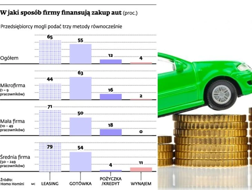 Spośród wielu sposobów finansowania samochodów firmowych największym sprzymierzeńcem mikro, małych i średnich przedsiębiorstw jest leasing. Przy zakupie floty samochodowej korzysta z niego aż 65 proc. firm – wynika z badania przeprowadzonego przez Instytut Badania Opinii Homo Homini. Leasing jest wybierany pięciokrotnie częściej niż pożyczka czy kredyt.