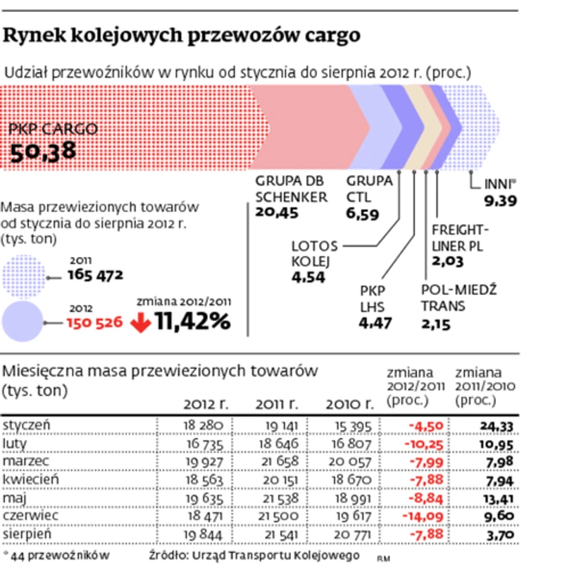 W pierwszym półroczu rynek kolejowych przewozów towarowych zdominowały dwie firmy: PKP Cargo i DB Schenker Rail (mają łącznie ponad 71 proc. udziałów). W ciągu pierwszych ośmiu miesięcy 2012 r. wszyscy przewoźnicy kolejowi przewieźli 150 tys. ton ładunków, czyli o prawie 12 proc. mniej niż rok wcześniej.
