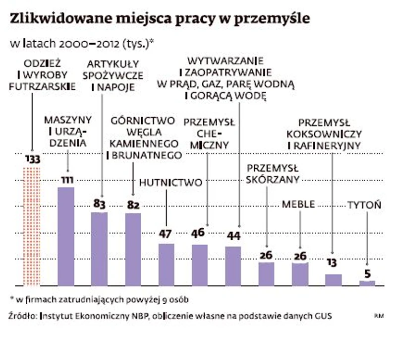 – Zlikwidowane miejsca pracy w dużym stopniu należały do przeszłości, do starej struktury gospodarki, w której stawiano między innymi na górnictwo i hutnictwo – mówi dr Janusz Jankowiak, główny ekonomista Polskiej Rady Biznesu. W tych branżach występowało nadmierne zatrudnienie. Dlatego dziś realizowany jest na przykład program restrukturyzacji górnictwa węgla kamiennego. Przed laty stosowano w nim nawet bardzo duże zachęty finansowe, skłaniające górników do rezygnacji z pracy w kopalniach. Z kolei pracownicy z innych branż – np. odzieżowej – tracili etaty, ponieważ ich przedsiębiorstwa nie wytrzymywały konkurencji z tanim importem z Chin. – Dobrze byłoby, aby w miejsce zlikwidowanych etatów powstały nowe, w nowoczesnych, innowacyjnych przemysłach – uważa dr Jankowiak.