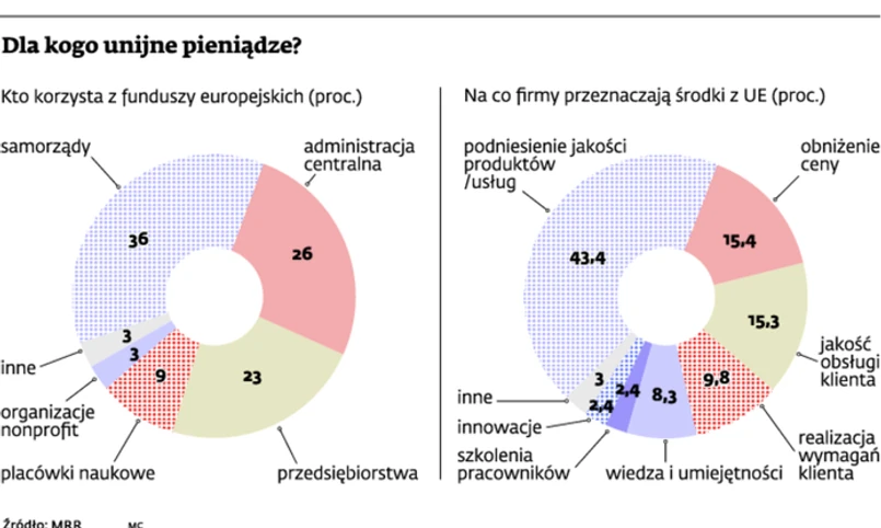Europejskie środki najczęściej wydawane są na podniesienie jakości produktów i usług, obniżenie ceny, podniesienie jakości obsługi klienta. Nieco mniej pieniędzy (około 11 proc.) przeznaczane jest na związane z doskonaleniem kompetencji zawodowych inwestycje: szkolenia pracowników oraz pomagające w prowadzeniu firmy zdobywanie wiedzy i nowych kompetencji, wiedzy i umiejętności.