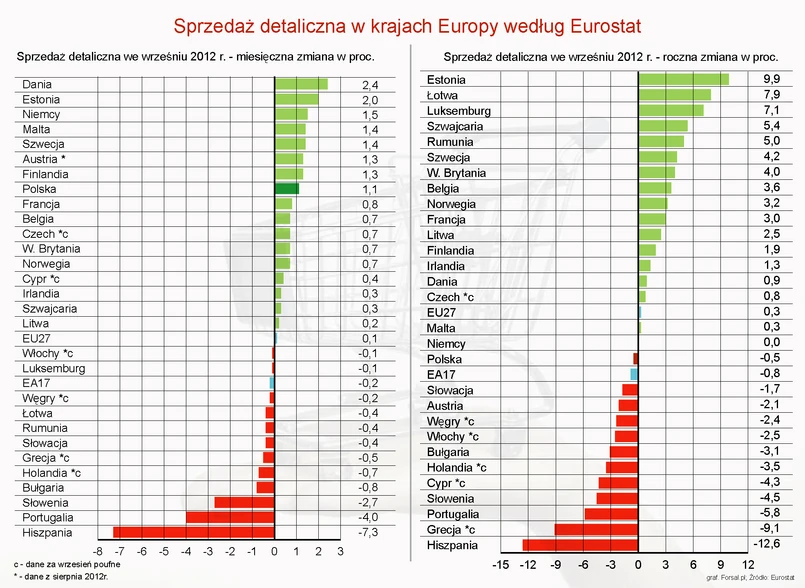 W porównaniu z wrześniem 2011 roku najszybciej wzrosła sprzedaż detaliczna w Estonii (9,9 proc.), na Łotwie (7,9 proc.) i w Luksemburgu (7,1 proc.). Największe spadki zanotowała Hiszpania (-12,6 proc.), Portugalia (-5,8 proc.) i Słowenia (-4,5 proc.)
