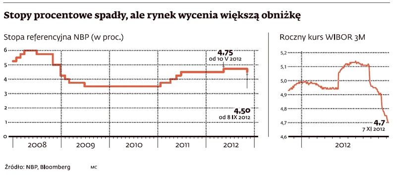 Jednak przedstawiciele biznesu nie kryją rozczarowania. – To nie wystarczy, by pobudzić firmy do inwestycji – mówi Damian Zalewski, PR manager w Vox Meble. Wtóruje mu Remigiusz Chrzanowski, szef marketingu Łucznika. Twierdzi, że obniżka powinna wynieść 0,75 pkt proc., aby miała wpływ na decyzje inwestycyjne. Jest szansa, że stopy spadną bardziej. Marek Belka zapowiedział, wczorajsza obniżka to początek łagodzenia polityki pieniężnej. Na dalsze redukcje liczą także inwestorzy. Z notowań kontraktów terminowych FRA, które obrazują oczekiwania rynku co do notowań stopy WIBOR 3M (od niej zależy oprocentowanie kredytów dla firm i hipotecznych), wynika, że rynek spodziewa się w sumie spadku tej stopy w ciągu 6 miesięcy o blisko 100 pkt proc. Czyli, w uproszczeniu, oczekują, że o tyle w sumie RPP obniży stopy.