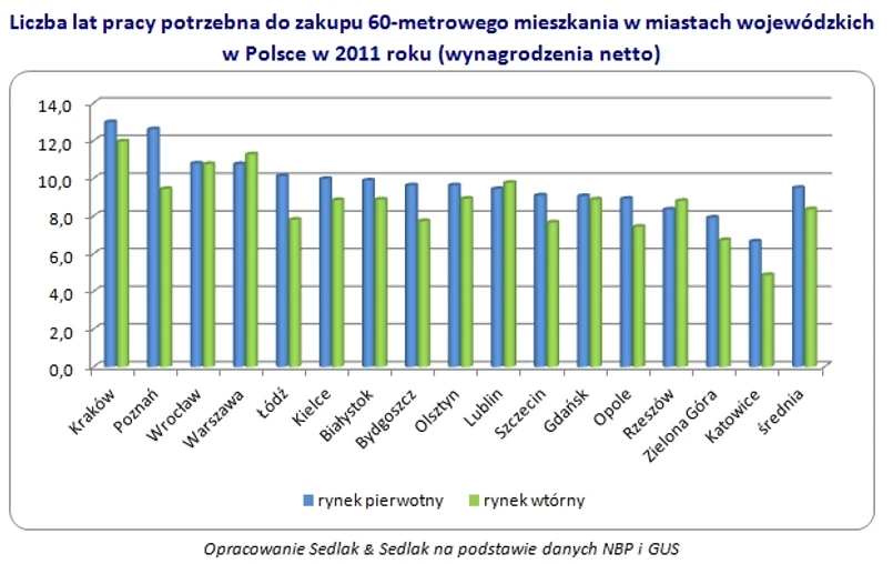Najdłużej na mieszkanie musza oszczędzać mieszkańcy Karkowa – co może tłumaczyć stereotyp „krakowskiego centusia”. Odkładając całą pensję, na nowe mieszkanie z rynku pierwotnego oszczędziliby dopiero po 13 latach. Rok wcześniej stać ich będzie na mieszkanie z rynku wtórnego. Powyżej 10 lat na mieszkanie odkładać muszą też mieszkańcy Poznania, Wrocławia i Warszawy.
