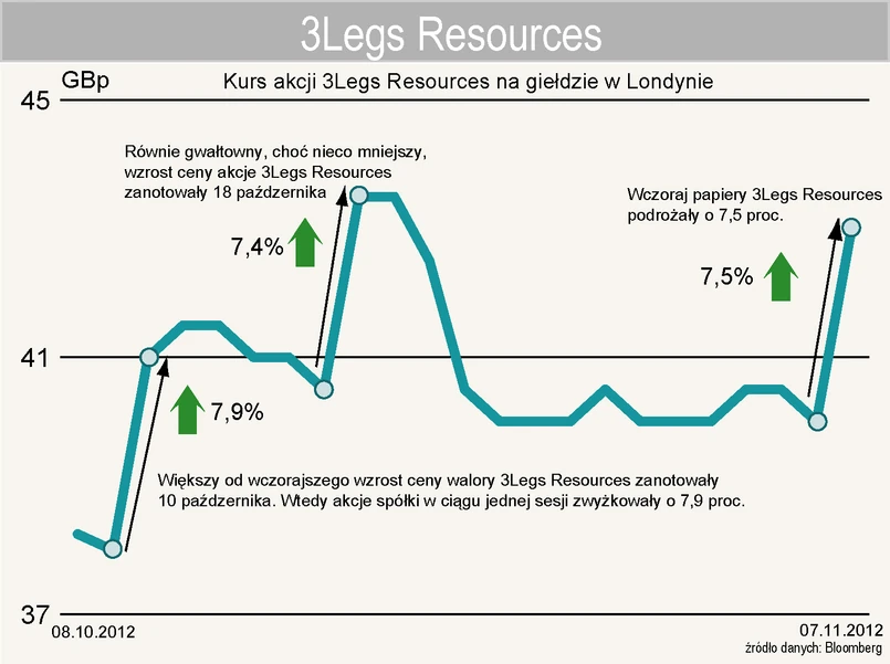 Notowania 3Legs wzrosły wczoraj o 7,5 proc. do 43 pensów. To największy zysk na akcjach spółki od 10 października.