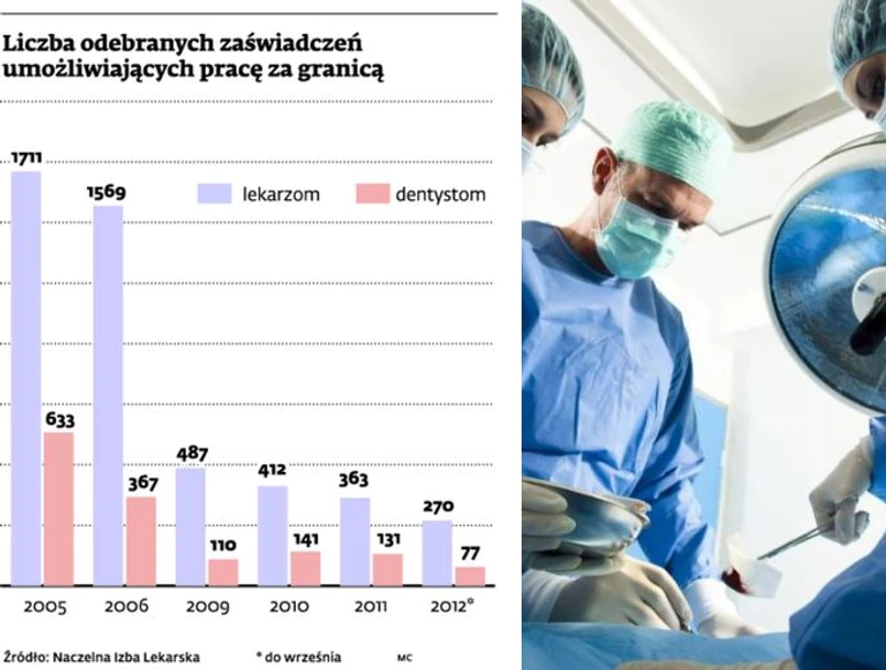 W zeszłym roku zaświadczenia uprawniające do wykonywania zawodu za granicą odebrało 363 lekarzy, w tym roku do września było ich już 270. To jednak prawie pięciokrotnie mniej niż w 2005 r., kiedy chętnych do wyjazdów było 1711 lekarzy. Coraz częstszą formą są tzw. wyjazdy rotacyjne, które pozwalają na łączenie pracy w kraju z pracą w innym państwie. To mogą być np. wyjazdy na weekendy na przeprowadzenie cyklu operacji.