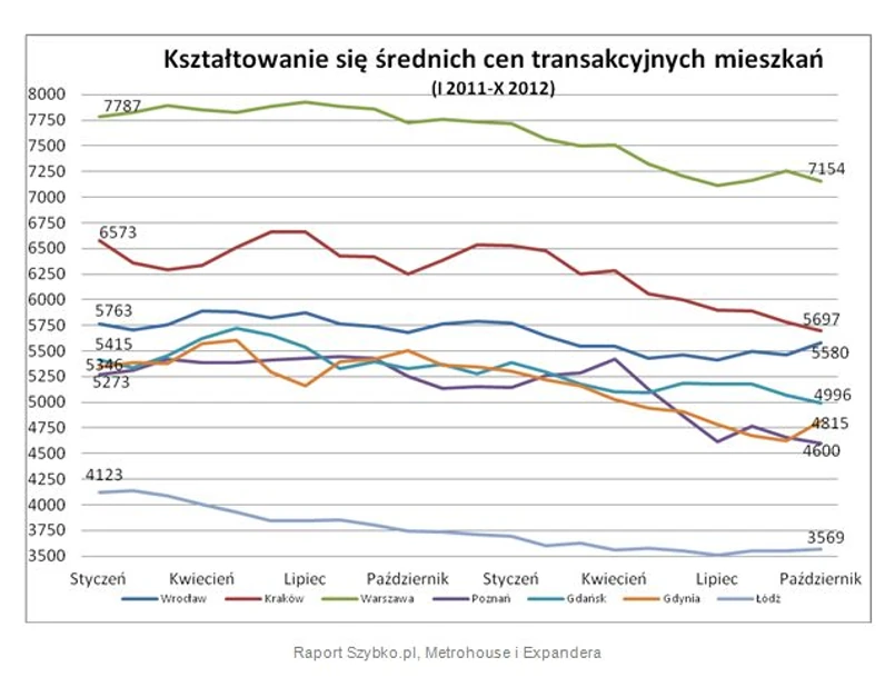 Według raportu średnie ceny transakcyjne za metr kwadratowy wyniosły w październiku: w Warszawie - 7,1 tys. zł, w Krakowie - 5,6 tys. zł, we Wrocławiu - 5,5 tys. zł, w Gdańsku - 4,8 tys. zł, w Gdyni - 4,8 tys. zł, w Poznaniu - 4,6 tys. zł, w Łodzi - 3,5 tys. zł.