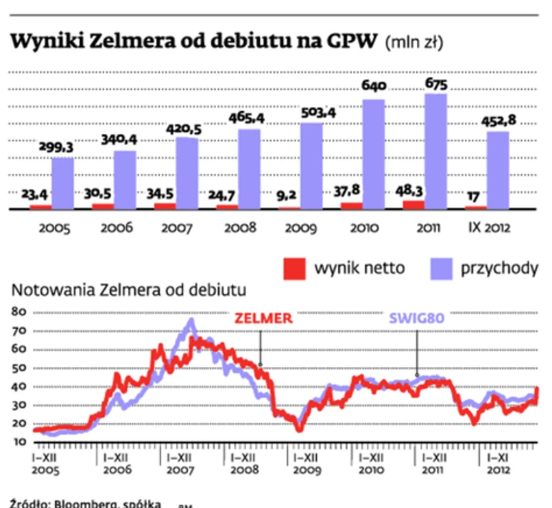 Dzięki dywersyfikacji sprzedaży przez siedem lat przychody spółki zwiększyły się ponaddwukrotnie. W 2005 r. wynosiły 299,3 mln zł, a w 2011 r. już 674,9 mln zł. Z trzech milionów sztuk wyprodukowanych w 2011 r. przez Zelmera urządzeń 52 proc. trafiało na zagraniczne rynki. Ten rok również zapowiada się dobrze. Dowodem na to są wyniki za pierwsze trzy kwartały. Przychody wyniosły 452,8 mln zł. Są o 5,5 proc. wyższe niż w analogicznym okresie ubiegłego roku, a zysk netto sięgnął 19,6 mln zł, zwiększając się o ponad 20 proc.