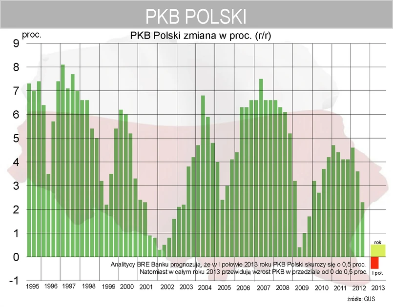 Polska jako jedyna w Unii Europejskiej uniknęła w 2009 roku recesji. Analitycy BRE Banku twierdzą, że teraz gospodarka nie wykaże się już taką odpornością na kryzys. PKB Polski skurczy się w pierwszej połowie 2013 roku o 0,5 proc. – wynika z opublikowanych w czwartek prognoz BRE Banku. Analitycy oczekują jednak, że w całym 2013 roku wzrost PKB zamknie się w przedziale 0-0,5 proc.