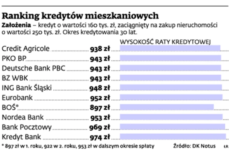 O pozycji w przygotowanym dla nas rankingu decydowała wysokość miesięcznej raty. Na najniższe miesięczne koszty obsługi kredytu mogą liczyć osoby, które zdecydują się skorzystać z oferty Credit Agricole Bank Polska. Tu rata wyniesie 938 zł. Kilka złotych więcej, bo 943 zł miesięcznie, będą spłacać klienci PKO BP, Deutsche Banku PBC i BZ WBK. Wszyscy zostaną zmuszeni do założenia konta w danej instytucji. Dodatkowo klienci zwycięskiego banku będą musieli za jego pośrednictwem ubezpieczyć się na życie, kredytobiorcy PKO BP – będą zobowiązani do wykupu polisy od bezrobocia, a Deutsche Bank PBC wymaga zakupu karty kredytowej. Na piątym miejscu znalazł się ING Bank Śląski, z wynikiem 948 zł. Natomiast szóstą lokatę uzyskał BOŚ Bank. Przez większość okresu kredytowania jego klienci będą płacili 953 zł miesięcznie. W pierwszym i drugim roku mogą liczyć na niższe obciążania, dzięki promocyjnie obniżonym marży i oprocentowaniu.