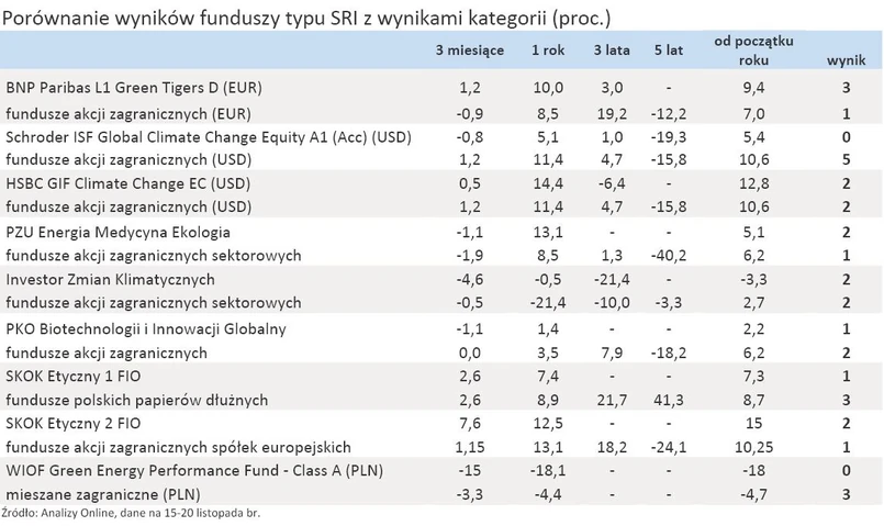 Okazało się że tylko trzy fundusze etyczne spośród dziewięciu analizowanych były w większości okresów lepsze od średniej, przy czym dwa z nich istnieją krócej niż trzy lata. Jedynym, który istnieje dłużej niż trzy lata i wygrał swoją batalię, jest BNP Paribas L1 Green Tigers denominowany w euro, a inwestujący co najmniej dwie trzecie pieniędzy w spółki, których technologie, produkty i usługi związane są ze zrównoważonym rozwojem i stanowią rozwiązania problemów środowiskowych w Azji.