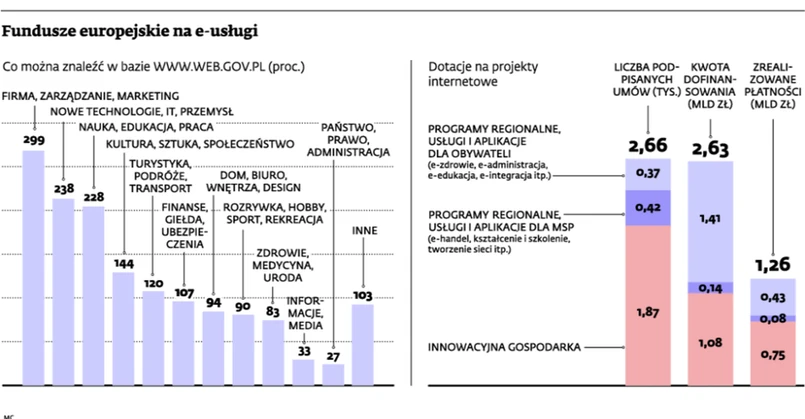 Po dotacje na e-usługi ustawiały się – w dosłownym tego znaczeniu – gigantyczne kolejki. Trudno się dziwić, z punktu widzenia beneficjenta jest to chyba najatrakcyjniejszy rodzaj dotacji. Tworzeniu e-biznesów przyświeca zasada „ja nie mam nic, ty nie masz nic, razem mamy pół miliona dotacji”. Wkład własny w realizowanych projektach jest minimalny i może być rozliczany na przykład nakładem pracy według stawek, które wnioskodawca sam sobie ustali.