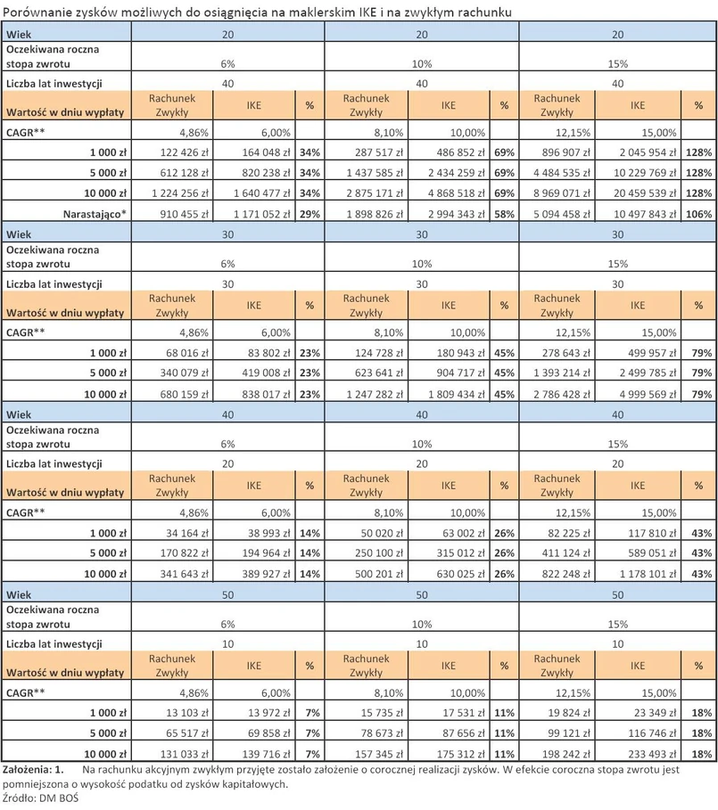 W skrajnych przypadkach może to być nawet 128 proc. więcej. Oto przykład takiej sytuacji: dwóch 20-latków zakłada konta. Jeden zwykły rachunek maklerski, drugi IKE. Obydwaj inwestują nieprzerwanie przez 40 lat tyle samo (1 tys. zł, 5 tys. lub 10 tys. rocznie). Przy średniorocznej stopie zwrotu w wysokości 15 proc. posiadacz rachunku maklerskiego po upływie 40 lat i wpłatach 1 tys. zł na rok będzie miał na koncie np. 896 tys. zł. Właściciel maklerskiego IKE 2,045 mln zł. Jednak nawet w przypadku gorszych inwestorów (średnioroczny zwrot w wysokości 6 proc.) i krótszego okresu inwestowania różnica będzie znacząca. W przypadku okresu 30-letniego sięgnie 23 proc., 20-letniego – 14 proc., a w przypadku 10-letniego – 7 proc., i to niezależnie od inwestowanej co roku sumy (1 – 10 tys. zł).