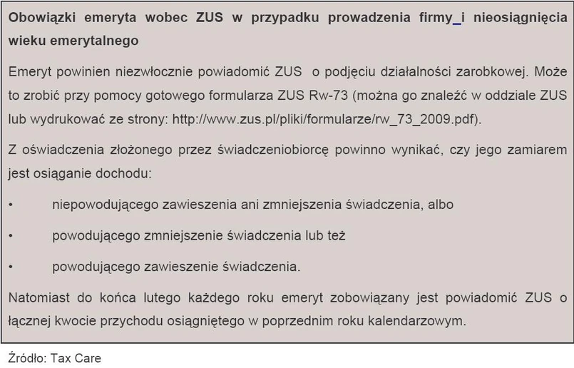Emeryt powinien niezwłocznie powiadomić ZUS o podjęciu działalności zarobkowej. Może to zrobić przy pomocy gotowego formularza ZUS Rw-73 (można go znaleźć w oddziale ZUS lub wydrukować ze strony: http://www.zus.pl/pliki/formularze/rw_73_2009.pdf).
