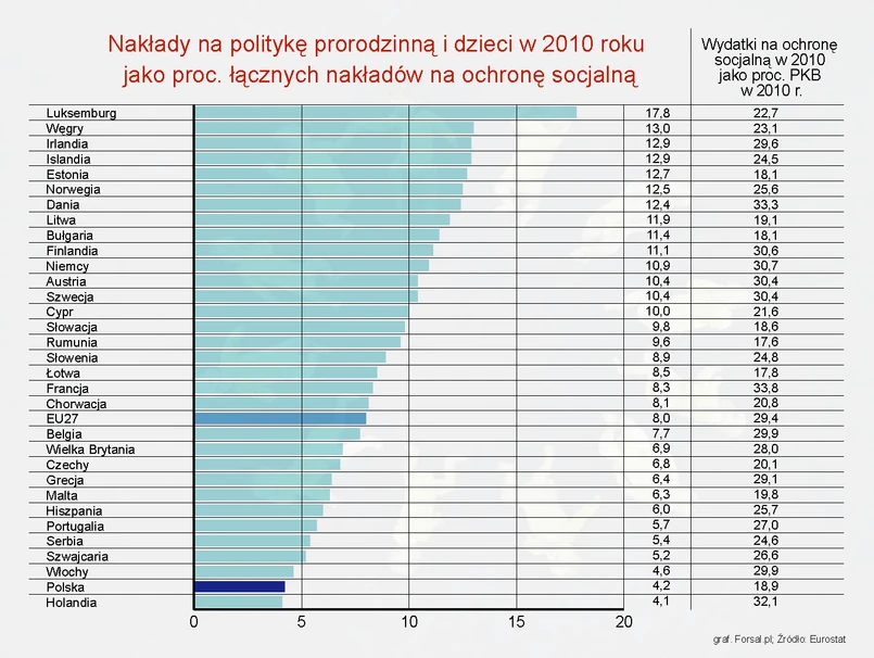 Ciekawa jest struktura wydatków socjalnych w naszym kraju. Zajmujemy bowiem pierwsze miejsce w UE jeśli chodzi o część wydawanych na świadczenia społeczne pieniędzy, którą pochłaniają emerytury oraz renty rodzinne (przyznawane w przypadku śmierci członka rodziny) – jest to aż 60,6 proc. Zaraz za nami w tej kategorii znalazły się Włochy (60,6 proc.), a następnie dopiero Malta (54,9 proc.). Wysokie wydatki na emerytury ponoszone były u nas kosztem wydatków na świadczenia rodzinne, które z kolei były prawie najniższe w całej UE. Przy unijnej średniej 8 proc., Polska na wspieranie rodziny i dzieci wydawała jedynie 4,2 proc. pieniędzy przeznaczanych na świadczenia społeczne – niższy procent był wydawany tylko w Holandii. Z kolei wysoko ponad średnią znalazł się Luksemburg (17,8 proc.), a także Węgry (13 proc.), Irlandia (12,9 proc.) i Estonia (12,7 proc.).