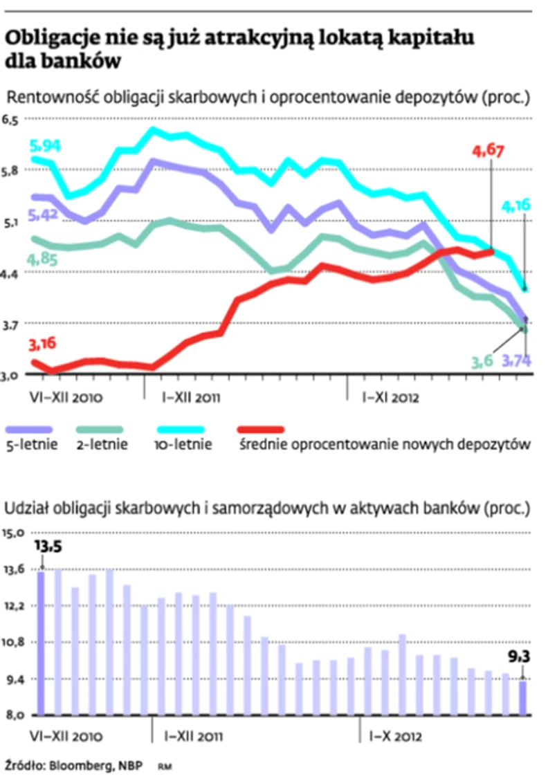 W przypadku obligacji 10-letnich nastąpił w tym czasie spadek z niemal 4,7 do niespełna 4,2 proc. Obniżka rentowności (a więc wzrost cen) to powód do zadowolenia dla resortu finansów, który może taniej finansować potrzeby pożyczkowe, a także dla osób, które zainwestowały w popularne ostatnio fundusze dłużne. Ale z punktu widzenia banków może oznaczać kłopot.