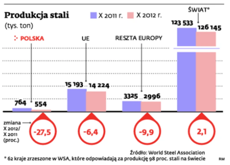 W październiku krajowe huty wytopiły 554 tys. ton stali, czyli aż o 27,5 proc. mniej niż w tym samym okresie 2011 r. Tąpnięcie zaszokowało branżę: spadek porównywalny z Polską przytrafił się w tym okresie w Europie tylko w pogrążonej w kryzysie Grecji. Dla porównania: w październiku produkcja stali w UE spadła tylko o 9,9 proc.