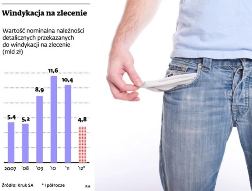 Liderzy obu segmentów rynku – windykacji należności detalicznych i korporacyjnych – w III kw. zaliczyli wyraźne spadki przychodów z windykacji na zlecenie, czyli tzw. inkasa. „Detalicznemu” Krukowi usługa ta zapewniła 7,62 mln zł wpływów netto – o ponad 28 proc. mniej niż w III kw. 2011 r. Grupa Pragma Inkaso specjalizująca się w odzyskiwaniu wierzytelności firmowych, pozyskała z windykacji na zlecenie 1,58 mln zł. To ponad 27-proc. spadek w skali roku.