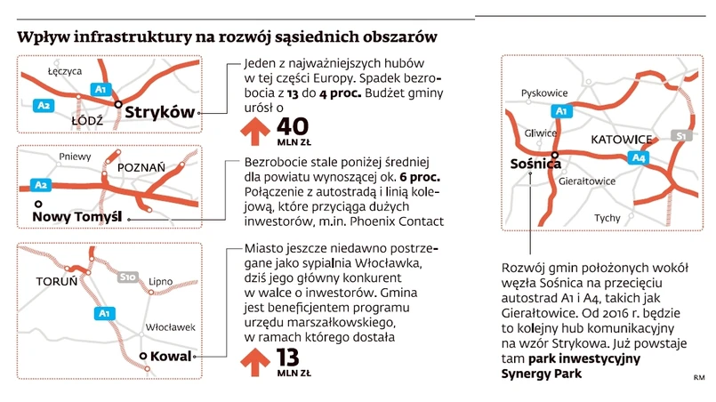 Takich przykładów jest więcej. Szczególnie wzdłuż autostrady A2. Np. Nowy Tomyśl (woj. wielkopolskie), od którego zresztą wzięła się nazwa węzła autostradowego. – To, co przeżywa teraz Stryków, myśmy mieli już kilka lat temu, gdy powstała kulczykówka. Teraz liczymy na to, że efekt ten wzmocni się po wydłużeniu autostrady do granicy w Świecku – mówi wiceburmistrz miasta Wojciech Ruta.