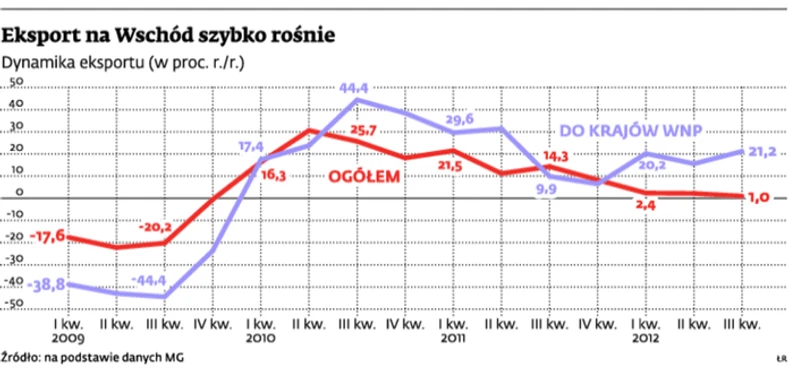 Większa sprzedaż ubezpieczeń należności w eksporcie za Bug to właśnie bezpośredni skutek dynamicznie rosnącego eksportu na tamte rynki. Po 9 miesiącach 2012 r. sprzedaż towarów z Polski do krajów Europy Środkowo-Wschodniej warta był 10 mld euro, o 19,3 proc. więcej niż w ciągu trzech kwartałów 2011 r. Ponad połowa tego eksportu trafiła do Rosji.
