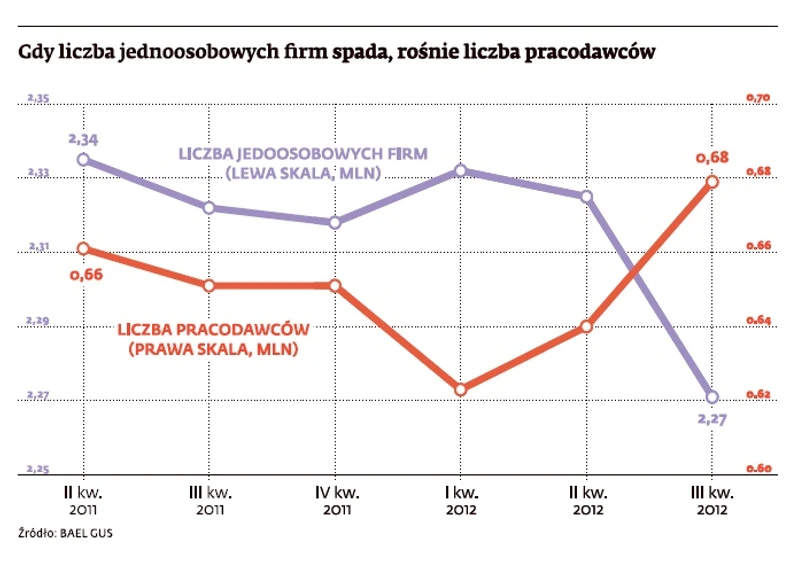 Z kolei liczba pracodawców wzrosła nie tylko dlatego, że małe firemki zatrudniają krewnych. – Część jednoosobowych firm zdecydowała się na zatrudnienie większej liczby osób jeszcze pod koniec ubiegłego roku lub nawet w pierwszej połowie tego, gdy koniunktura gospodarcza była jeszcze dobra – wyjaśnia Jakub Borowski, główny ekonomista Kredyt Banku.