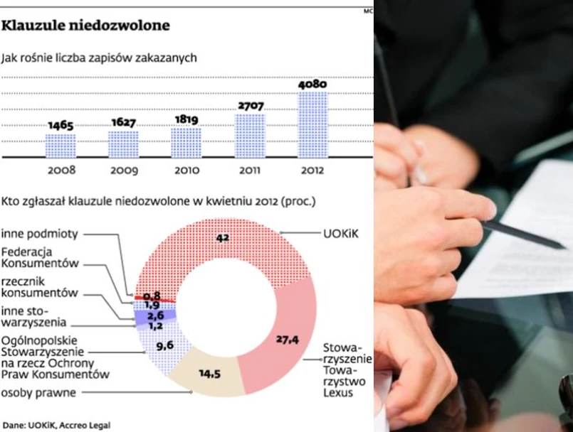 Potwierdza to UOKiK. – W latach 2011–2012 do rejestru zostało wpisanych ponad 1300 klauzul – mówi nam Maciej Chmilowski z urzędu. Przyznaje, że UOKiK nie ma żadnego nadzoru nad stowarzyszeniami składającymi pozwy do SOKiK. Podobnie nie kontrolują ich Ministerstwo Sprawiedliwości ani Federacja Konsumentów.