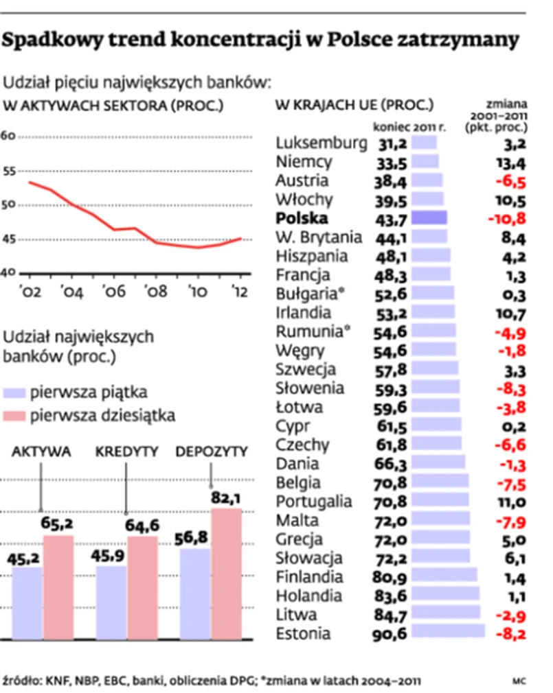 Teraz specjaliści podkreślają, że polski sektor bankowy należy do niezbyt skoncentrowanych. „Wskaźnik udziału pięciu największych banków w aktywach sektora bankowego jest jednym z najniższych w regionie i całej Unii Europejskiej” – napisał w opublikowanym niedawno raporcie o rozwoju sektora finansowego Narodowy Bank Polski. Zaznaczył, że już w ubiegłym roku czołowa piątka minimalnie zwiększyła udział w rynku. W bieżącym roku to się pogłębi: tylko połączenie BZ WBK z Kredyt Bankiem wystarczy, by oddać niemal piątą część spadku udziału pięciu największych banków, jaki miał u nas miejsce w latach 2001–2011.