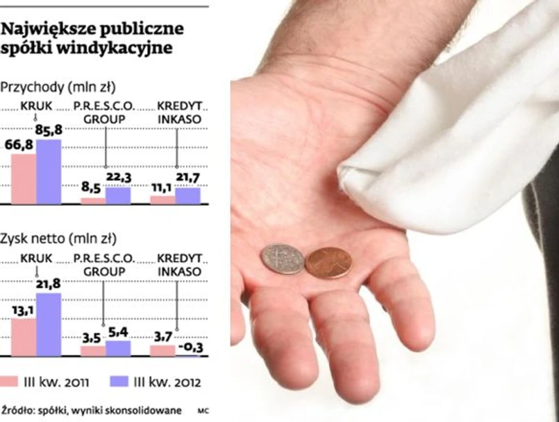 Do takich zalicza się największa z grupy publicznych firm windykacyjnych – spółka Kruk. W III kw. jej przychody wyniosły 85,8 mln zł, o 28,5 proc. więcej niż w tym samym okresie 2011 r. O dwie trzecie wzrósł zysk netto, który wyniósł 21,8 mln zł. Dynamicznie – o ponad 95 proc. – wzrosły przychody Kredyt Inkaso, choć wynikiem netto spółka rozczarowała, zaliczając stratę na poziomie 310 tys. zł. Do czołówki pod względem wielkości przychodów wskoczyło P.R.E.S.C.O. Group, które je niemal potroiło w ciągu roku. A zysk netto spółki wzrósł o połowę.