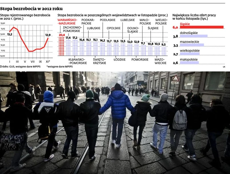Taką samą prognozę przedstawia Mateusz Sutowicz, ekonomista z Banku Millennium. Tylko nieco niższe bezrobocie, bo wynoszące 13,3 proc., przewiduje Piotr Kalisz, główny ekonomista banku Citi Handlowy. Z kolei Mateusz Szczurek, ekonomista z ING Banku Śląskiego, liczy, że osiągnie ono poziom 13,2 proc. Powód takiego pesymizmu to listopadowe informacje z rynku pracy. Według wstępnych danych resortu pracy w końcu tego miesiąca w urzędach pracy zarejestrowanych było 2 mln 59 tys. bezrobotnych. To o 64,1 tys. więcej niż w październiku i o 144 tys. więcej niż przed rokiem. W rezultacie stopa bezrobocia urosła do 12,9 proc. z 12,5 proc. w miesiącu poprzednim. – To zaskakująco szybki wzrost bezrobocia, bo pogoda była dobra, więc część prac sezonowych powinna być kontynuowana – mówi Karolina Sędzimir, ekonomistka PKO BP.
