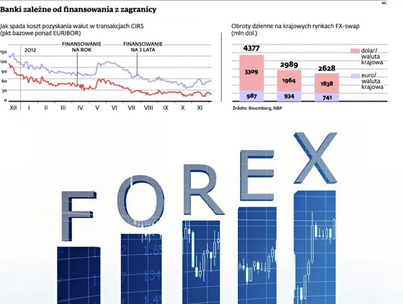 Choć żaden bank nie udziela już walutowych kredytów detalicznych, to te, które robiły to przed kilkoma laty, muszą nadal pozyskiwać finansowanie na tę część swoich aktywów. Najczęściej wykorzystują do tego dwa typy transakcji. Pierwszy to krótkoterminowy (trwający góra rok) kontrakt FX-swap. To umowa na zakup waluty po ustalonym wcześniej kursie i na jej późniejszą odsprzedaż. Drugi typ to kontrakty CIRS (currency interest rate swap). Trwają dłużej niż FX-swapy (od roku do pięciu lat) i są czymś w rodzaju wzajemnej pożyczki.