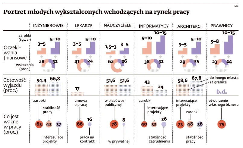 Po czwarte, absolwent jest konserwatystą – w pracy liczy się dla niego przede wszystkim stabilność. Największe oczekiwania mają informatycy: nawet młodzi, dopiero co zaczynający prace, od razu chcą zarabiać ponad 10 tys. zł. Dziś to jedyna grupa, która nadal dyktuje warunki na rynku. Druga grupa zawodowa, po informatykach, która nie musi się obawiać bezrobocia, to lekarze. Jednak w ich przypadku oczekiwania zarobkowe nie są aż tak niebotyczne. Większość liczy na pensje miedzy 3 a 5 tys. zł. Tylko co dziesiąty chciałby zarabiać ponad 10 tys. zł.