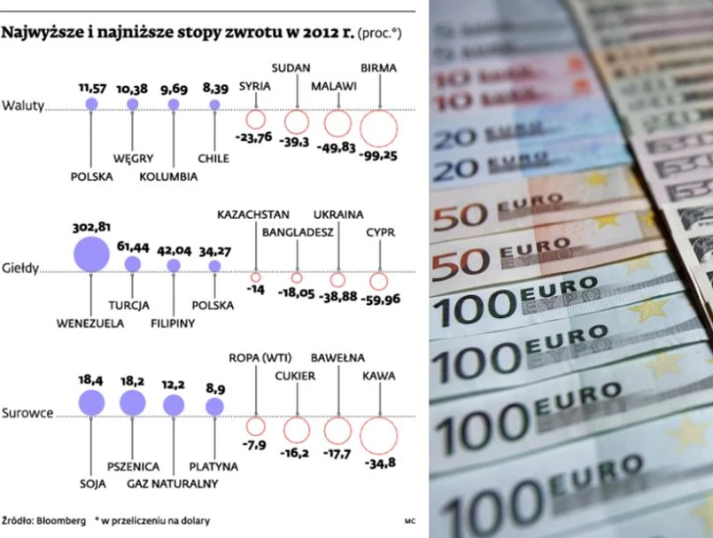 Widać to w zestawieniu największych wzrostów i spadków głównych indeksów światowych giełd, w którym nasz WIG20 zmieścił się w 2012 r. w pierwszej dziesiątce. W przeliczeniu na dolary indeks największych spółek warszawskiej giełdy zyskał ponad 34 proc. (wobec nieco ponad 20 proc. w złotych).