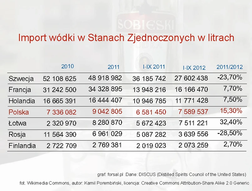 Według danych Distilled Spirits Council of the United States, cytowanej przez Polski Przemysł Spirytusowy, import polskiej wódki wzrósł w pierwszych trzech kwartałach 2012 roku o ponad 15 proc., dzięki czemu zajmujemy na rynku czwartą pozycję.