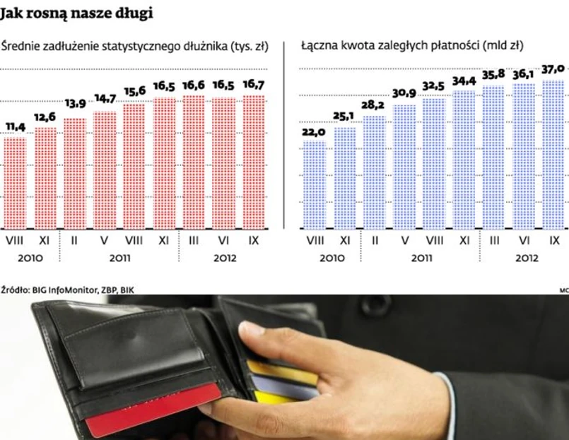 Z danych biura informacji gospodarczej BIG InfoMonitor wynika, że obecnie statystyczny Polak jest zadłużony na ponad 16 tys. zł. To ok. 5 tys. zł więcej niż jesienią 2010 roku. Trudności ze spłatą swoich zobowiązań ma już 2,2 mln naszych rodaków, a łączna kwota zaległych płatności wzrosła w ciągu dwóch lat z 22 mld zł do 37 mld zł obecnie. Jak widać, problem narasta w bardzo szybkim tempie.