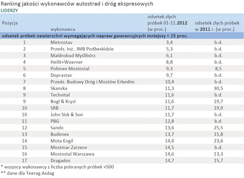 W nowym zestawieniu najgorzej wypadły firmy, które z nadaniem jakości nie miały wcześniej do czynienia, bo albo w 2011 r. pełniły rolę podwykonawców, albo nie zostały objęte badaniem z powodu zbyt małej liczby pobranych próbek (poniżej 50). To np. Intop Tarnobrzeg, HAK Construction i PRD Puławy.
