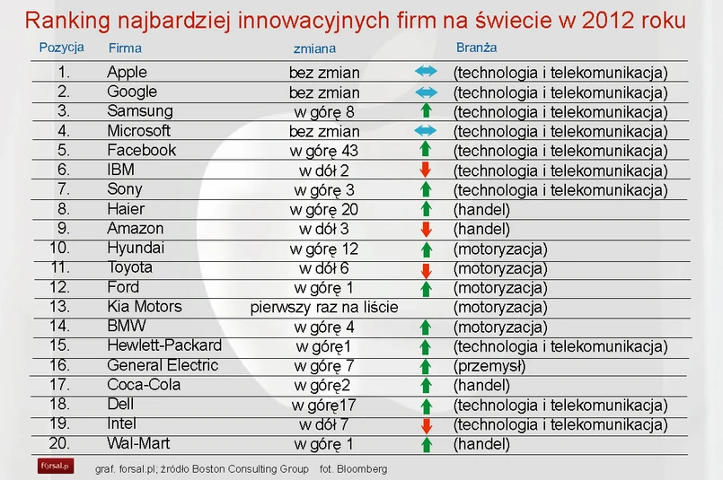 Na pierwszym miejscu listy 50 najbardziej innowacyjnych firm świata w 2012, przygotowanej przez Boston Consulting Group i opublikowanej na początku stycznia po raz kolejny znalazł się Apple. Od przeszło 5 lat, amerykańska spółka wraz ze swoim największym konkurentem Google plasują się na czele opracowania BCC.