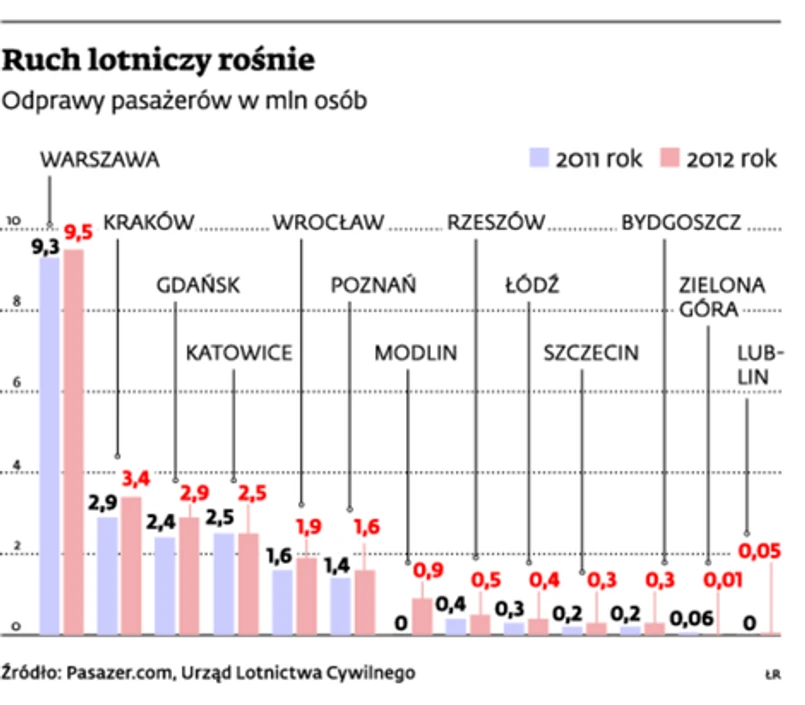 To przesunięcie w preferencjach mieszkańców regionów widać coraz wyraźniej w statystykach ruchu lotniczego. Według portalu lotniczego Pasazer.com w 2012 r. polskie porty obsłużyły w sumie 24,7 mln pasażerów – o 13 proc. więcej w porównaniu z 2011 r. Z tej liczby 9,5 mln pasażerów przypadło na stołeczne lotnisko. Tymczasem jeszcze pięć lat temu odlatywał stąd w świat co drugi Polak.