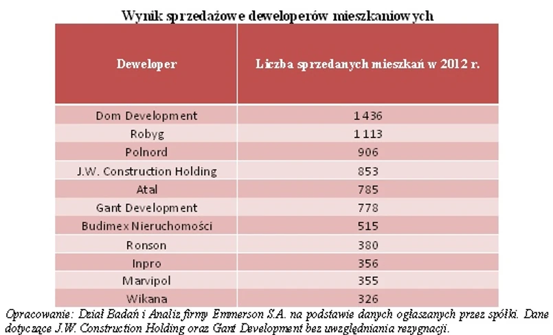 Najwięcej mieszkań w ubiegłym roku sprzedał Dom Development zostawiając daleko w tyle swojego tradycyjnego konkurenta J.W. Construction. Drugie miejsca zajął wspomniany już Robyg, który wykazał się na przestrzeni całego roku elastycznością oraz dobrym dopasowaniem swojej oferty do aktualnych możliwości klientów. Na trzecim miejscu znalazł się Polnord, któremu nie udało się już osiągnąć pułapu 1 000 sprzedanych mieszkań. Budimex Nieruchomości nawet pomimo wzrostu sprzedaży rok do roku o 90% nie zrealizował wcześniej zakładanego planu na 2012 r. Na wyróżnienie z pewnością zasłużył nieobecny na giełdzie Atal, który w porównaniu do 2011 r. odnotował 50%-owy wzrost sprzedaży. Był on możliwy m.in. dzięki wejściu na rynek warszawski oraz silnej ekspansji tej firmy w Krakowie. Nowe projekty w tych miastach charakteryzowały się konkurencyjnymi cenami i jakością w stosunku do pobliskich inwestycji dzięki czemu sprzedaż postępowała w nich szybciej i to pomimo mniejszego zaawansowania stanu budowy.