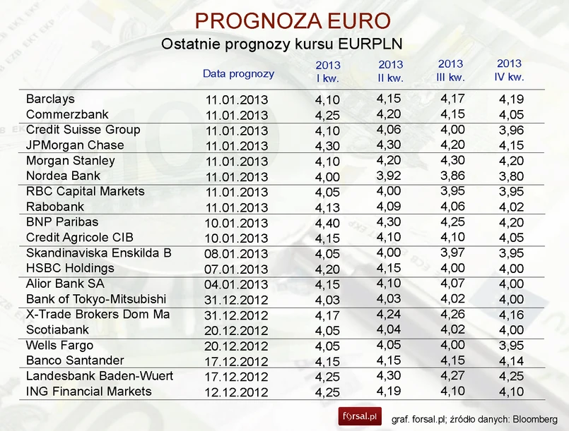 Jak wynika z prognoz banków zebranych przez Forsal.pl, największym pesymistą w ocenie potencjału polskiej waluty jest niemiecki Landesbank Baden-Wuert. Prognozuje on, że na koniec 2013 roku kurs EUR/PLN będzie sięgać 4,25. Mocne osłabienie złotówki przewiduje też francuski BNP Paribas i amerykański Morgan Stanley (4,20 zł za euro) oraz brytyjski Barclays (4,19 zł za euro).