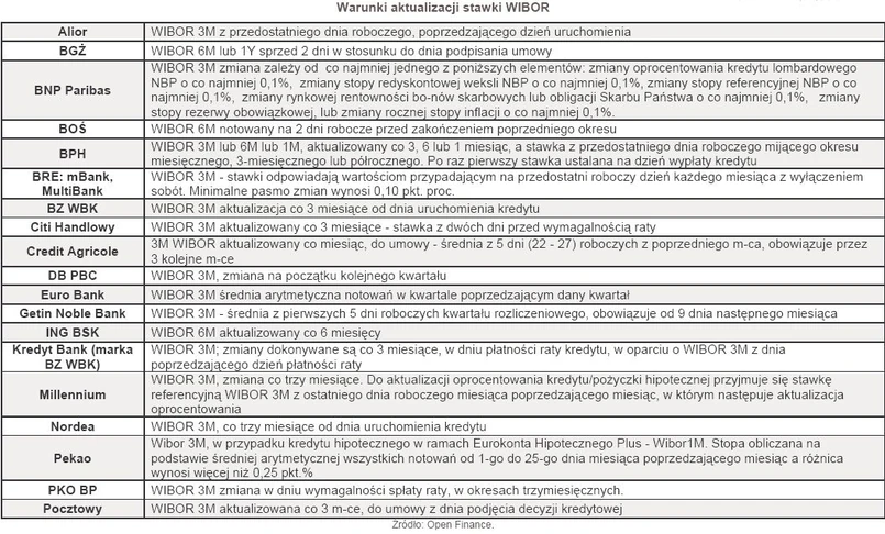 W Citi Handlowym będzie to stawka z dwóch dni przed wymagalnością raty. W BZ WBK, aktualizacja za każdym razem nastąpi w trzy miesiące od daty uruchomienia kredytu, identycznie jest również w Nordei. W PKO BP aktualizacja następuje co trzy miesiące na dzień spłaty raty . W Pocztowym – znaczenie ma dzień podjęcia decyzji kredytowej. W Credit Agricole przez kolejne trzy miesiące obowiązuje średnia z 5 dni roboczych od 22 do 27 poprzedniego miesiąca.