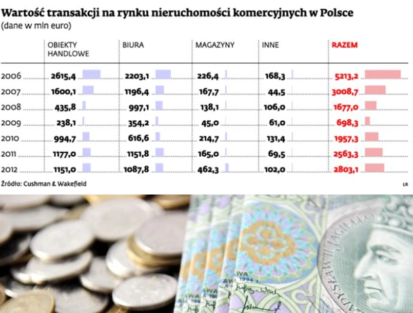 Na rynku nieruchomości handlowych w tym roku łączna wartość sfinalizowanych transakcji może wynieść 0,75–1 mld euro. Oznaczałoby to wynik gorszy przynajmniej o 100 mln euro w porównaniu z 2012 r. oraz o ponad 300 mln euro w porównaniu z 2011 r. – szacują analitycy międzynarodowej agencji nieruchomości Jones Lang LaSalle. Nabywcami tego typu obiektów są zwykle międzynarodowe fundusze inwestycyjne.