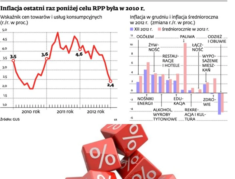 W grudniu ceny były o 2,4 proc. wyższe niż rok wcześniej. W miesiąc roczna inflacja obniżyła się o 0,4 pkt proc. – podał GUS. Pierwszy raz od sierpnia 2010 r. znalazła się poniżej celu Rady Polityki Pieniężnej, który wynosi 2,5 proc. Tym samym okazała się niższa nawet od oczekiwań Marka Belki, prezesa Narodowego Banku Polskiego i przewodniczącego Rady Polityki Pieniężnej, który spodziewał się wyniku w granicach 2,5–2,6 proc.