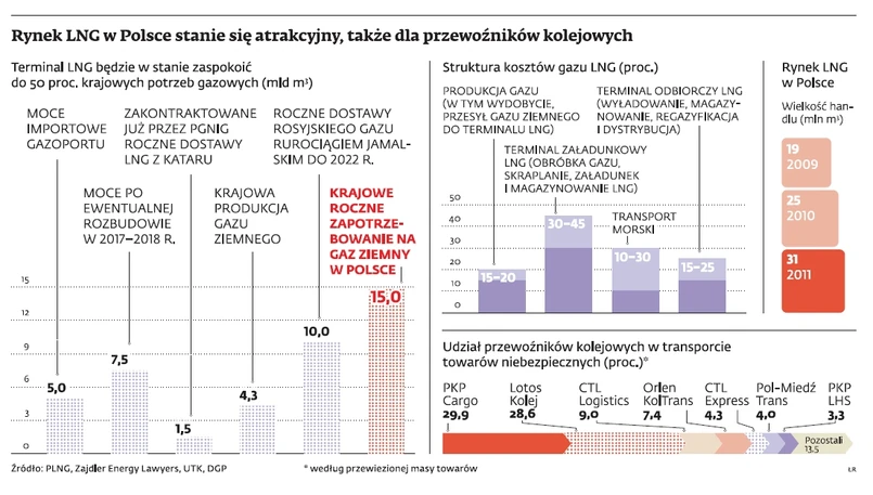 Biznes zwęszyły PKP Cargo. – Jeśli zyskamy kontrakt na przewóz LNG, jesteśmy w stanie powiększyć zdolności przewozowe o cysterny przystosowane do tego surowca – mówi Mariusz Przybylski z centrali spółki. Będzie miał konkurencję w postaci DB Schenker, drugiego w Polsce przewoźnika kolejowego cargo. – Nasza oferta może zawierać kompleksowe rozwiązania logistyczne transportu gazu skroplonego – deklaruje Małgorzata Smoleń z DB Schenker Rail Polska.