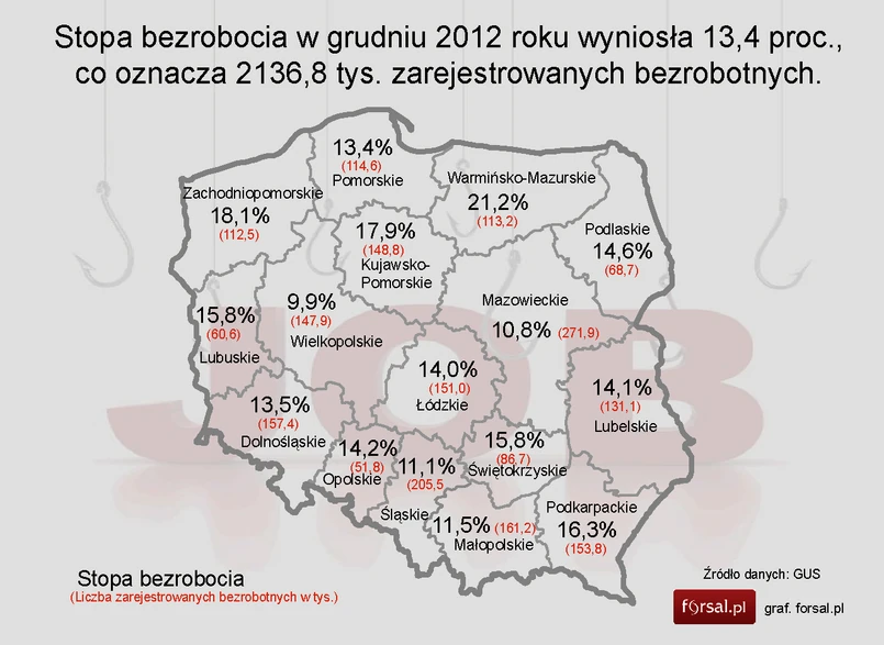 Najgorsza sytuacja na polskiej mapie bezrobocia panuje w województwie warmińsko-mazurskim. Stopa bezrobocia sięga tu 21,2 proc. O pracę ciężko też w Zachodniopomorskiem (18,1-proc. bezrobocie) oraz w Kujawsko-Pomorskiem (17,9 proc.).