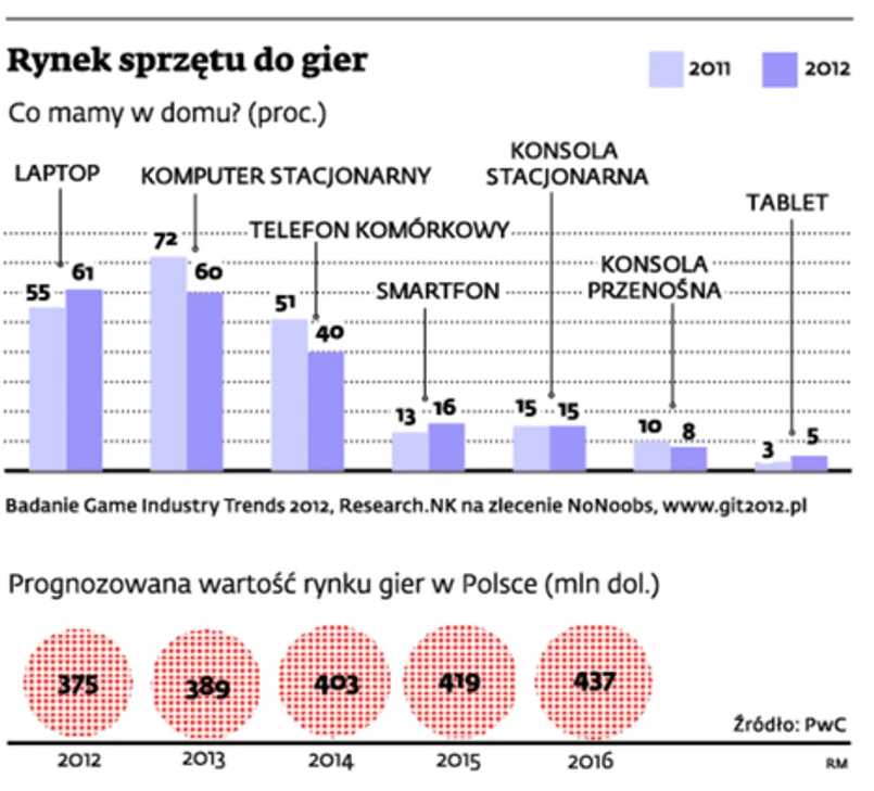 Producenci zobaczyli potencjał w coraz bardziej rosnącym rynku gier na urządzeniach mobilnych, zwłaszcza tabletach. W Polsce sprzedało się ich w ubiegłym roku, według różnych szacunków, od 0,5 do 1 mln sztuk. W tym może być nawet 1,5 mln. Tak duży wzrost to zasługa głównie tanich urządzeń, kosztujących poniżej 1000 zł, takich producentów jak Manta, Modecom czy GoClever i Lark, a także znanych marek (Samsung, Asus czy Huawei), które też weszły na tę półkę cenową. W tym roku swoje urządzenia wprowadzą na rynek kolejni – m.in. Lenovo i Panasonic. Analitycy spodziewają się też większej konkurencji taniego sprzętu z Chin, wykorzystującego ekrany retina montowane w iPadach. Na Allegro już można znaleźć takie urządzenia jak Onda czy Vido w cenie ok. 1000 zł.