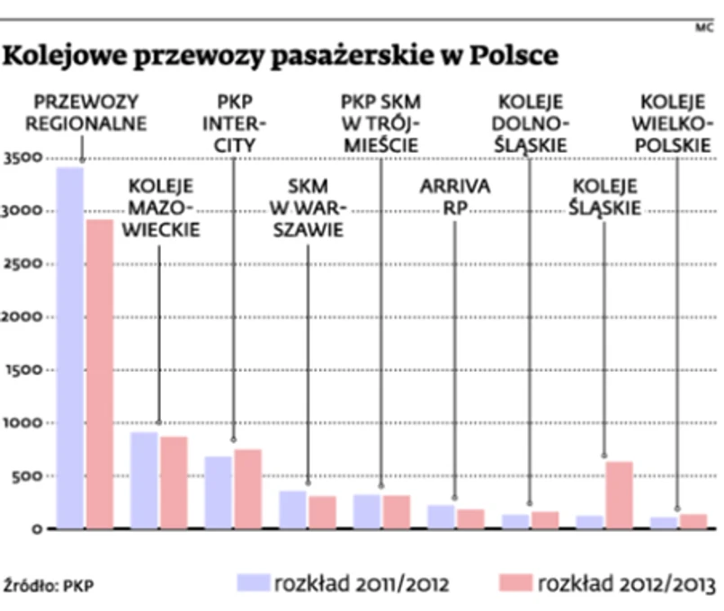 Od ponad dekady nie ma możliwości zakupu jednego biletu na całą trasę, co jest normalne np. w Niemczech. Jeśli wyruszamy w podróż expressem PKP Intercity, ale dalej chcemy pojechać pociągiem Regio Przewozów Regionalnych, będziemy musieli kupić dwa bilety. Co zabawne, oba kupimy w tej samej kasie, niezależnie, czy należy ona do IC, czy PR. – Kolej w Polsce nie jest już wspólnym systemem. Konieczność kupowania osobnych biletów na pociągi różnych przewoźników zmusza pasażera do kilkukrotnego płacenia za początkowe kilometry, które w taryfach przewozowych są najdroższe – mówi ekspert kolejowy Karol Trammer.